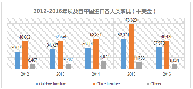 2016年埃及自中國戶外家具金額高達(dá)3797萬美金,辦公家具進(jìn)口額為4943萬美金,其他家具及零部件803萬美金。
