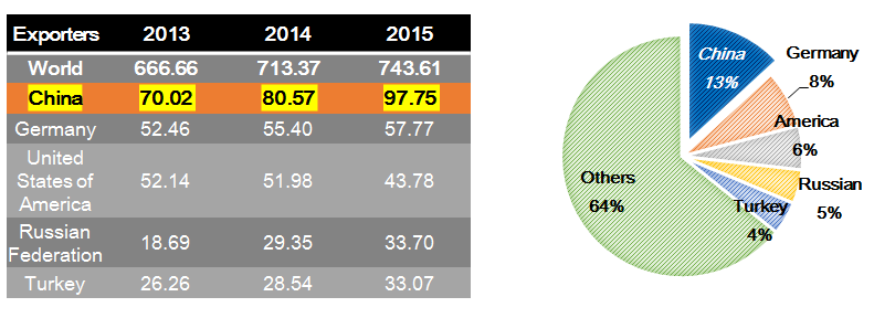 2015年埃及貿(mào)易進(jìn)口總額為743.61億美元,其中,中國(guó)對(duì)埃及出口97.75億美元,占比13%。是埃及第一大進(jìn)口來(lái)源國(guó)。