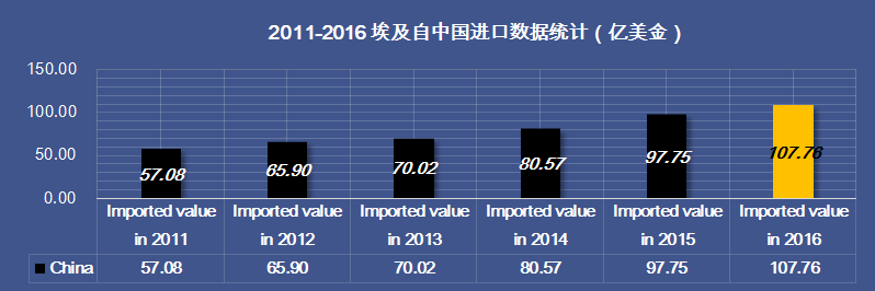 ?2016年,中國(guó)與埃及雙邊貨物進(jìn)出口額為113.25億美元,比去年同期(下同)下降12.03%。其中,中國(guó)對(duì)埃及出口107.76億美元,下降9.92%。受埃及實(shí)行進(jìn)口注冊(cè)制影響。