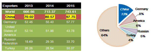 2015年埃及貿(mào)易進(jìn)口總額為743.61億美元,其中,中國對埃及出口97.75億美元,占比13%。是埃及第一大進(jìn)口來源國。