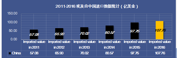 ?2016年,中國與埃及雙邊貨物進(jìn)出口額為113.25億美元,比去年同期(下同)下降12.03%。其中,中國對埃及出口107.76億美元,下降9.92%。受埃及實(shí)行進(jìn)口注冊制影響。