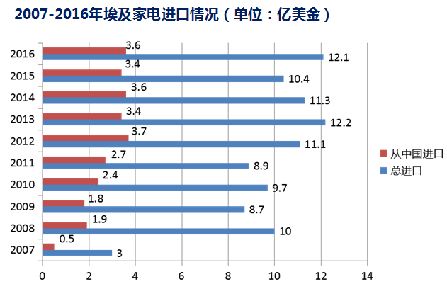 近年來埃及的政局并未直接影響到家電行業(yè)的進(jìn)口額。制冷電器、清潔電器、廚房電器仍是2016年熱門進(jìn)口產(chǎn)品。
