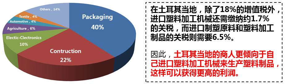 目前土耳其塑料制品主要用于包裝(40%)、建筑(22%)、電子(10%) 農業(yè)(6%)、汽車(4%)等行業(yè) 。其中包裝和建筑塑料制品的消費量占主要部分。