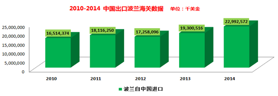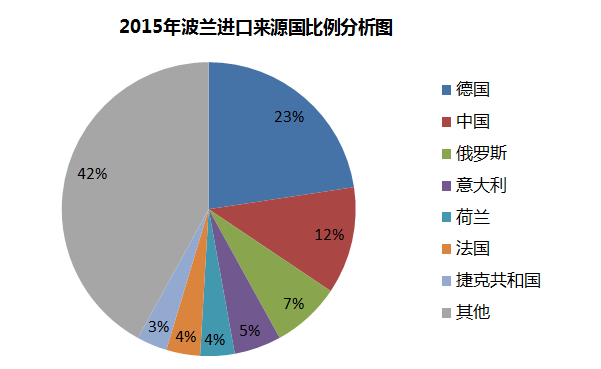 2015年波蘭貿(mào)易進(jìn)口總額為3841.57億美元,其中,中國對(duì)波出口536.4億美元,同比去年增長約3.8%,中國成為波蘭第二大進(jìn)口來源國。