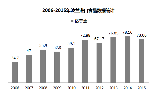 波蘭食品的進(jìn)口量穩(wěn)定上升,2015年進(jìn)口量是10年前的2.1倍。