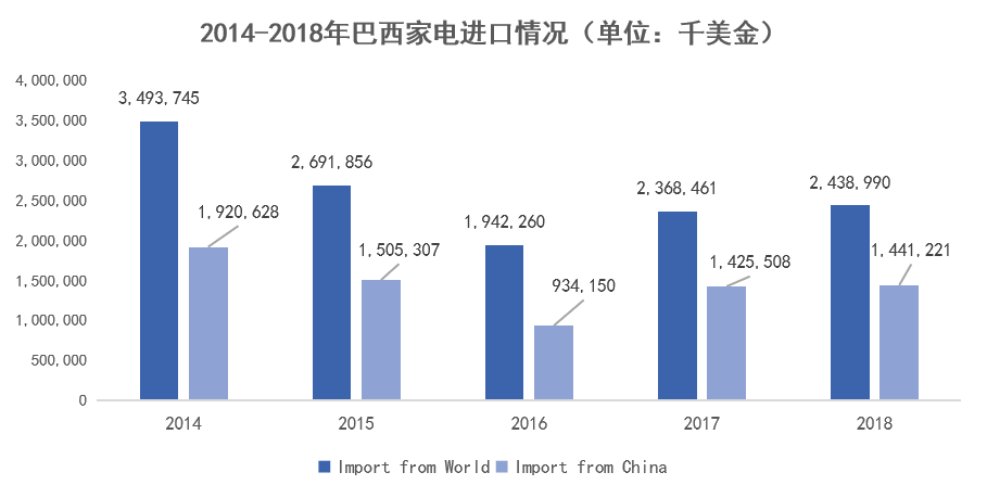 2018年巴西全球家電進(jìn)口額達(dá)24.38億美元。其中自中國(guó)進(jìn)口的家電占59.10%,約14.41億美元,是巴西家電第一進(jìn)口來(lái)源國(guó)。