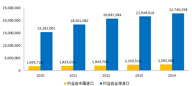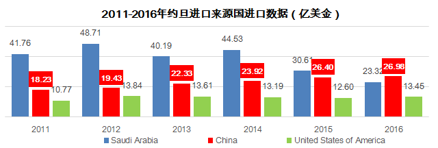 據約旦國家統(tǒng)計局數字,2016年約旦總進口額為192.61億美元,同比下降了5.92%;