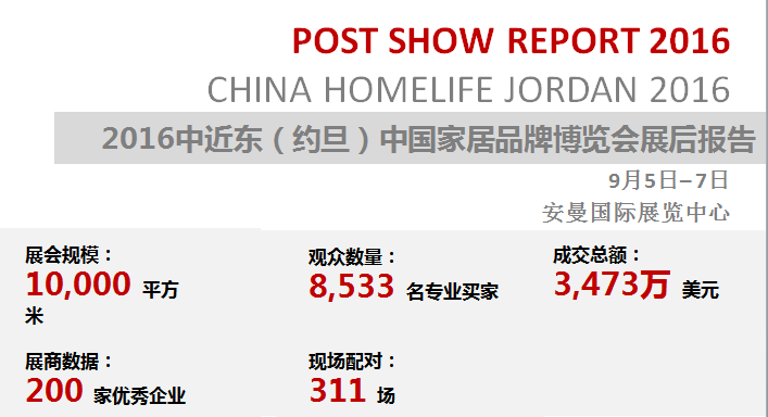第十三屆中近東(約旦)中國家居品牌博覽會于2016 年9 月 5 日在安曼國際展覽中心成功舉行。該展會是目前中國在約旦舉辦的規(guī)模最大的展會。